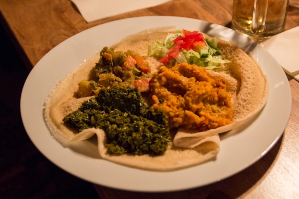 Alle Gerichte werden mit 3 Injera und Salatbeilage gereicht. Injera besteht zu je einem Drittel aus Weizen-, Mais- und Hirsemehl.