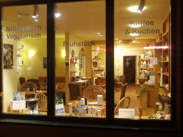 Wir bieten an: Frühstück, Mittagstisch und Kuchen. Alles zu 100 % biologische Zutaten. Alles 100% vegetarisch und mindestens 1 von 3 Gerichten vegan. Manchmal sogar alle 3 Gerichte unserer täglich wechselnden Speisekarte. Frühstück gibt es auch in vegan, sowie immer eine Torte vegan ist. In unserem Ladenbereich verkaufen wir Tee, Dr. Hauschka Kosmetik und kleine Geschenke. Im Reformhaus nebenan gibt es aus Überzeugung nur vegetarische Lebensmittel. Sowie ein großes Angebot an gluten- und laktosefreiene Lebensmitteln.