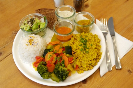 Dazu reicht das ebenfalls vegane Ladensortiment von Gewürzen, Dals, Nahrungsergänzungen und Tees bis zu ausgewählten Pflegeprodukten aus dem ayurvedischen Umfeld.