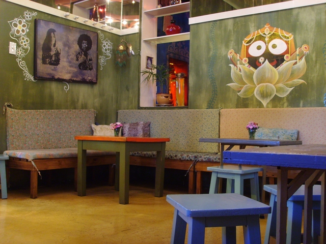 totalmente hippie, comida de Hare Krishna, lacto vegetariano. Pregunta cuales platos son veganos o cuales pueden hacer vegano
