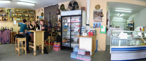 Sehr ansprechender Innenraum im arabischen Stil mit Sitzgelegenheiten und Stehtische, auch für den schnellen Imbiss.