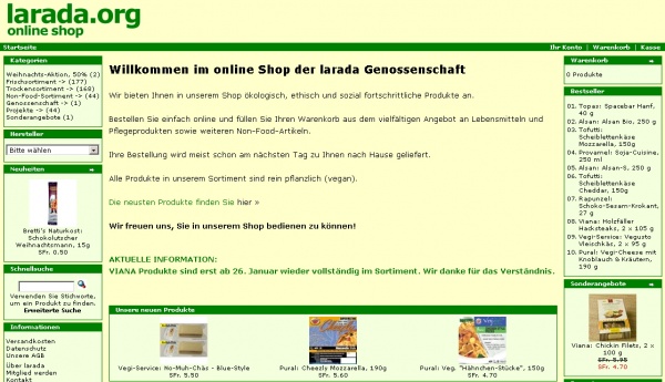 Larada verkauft ökologisch, ethisch und sozial fortschrittliche Produkte in dem Online Shop larada.org. Das Sortiment wird laufend erweitert und den Kundenbedürfnissen angepasst. Der Online-Shop ist rund im die Uhr geöffnet und ermöglicht es somit jedem Interessierten, jederzeit an die gewünschten Produkte zu gelangen.