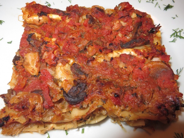 -Tomaten-Sauerkraut-Lasagne mit Salat und hausgemachtem Brot