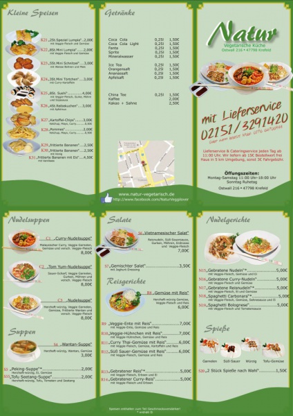 Natur ist ein vegetarisches Restaurant in der Innenstadt von Krefeld mit vielen veganen Speisen. Es gibt verschiedene Fleischimitate (z.B. Ente und Hühnchen) mit Gemüse und Reis oder Nudeln, aber auch Suppen,Salate, Sushi und anderes. Die Gerichte mit Ei sind in der Karte extra mit einem Sternchen markiert. Bei den Gerichten, die Sahne oder Honig enthalten steht dies in der Beschreibung. Das Essen schmeckt lecker und es gibt auch einen Lieferservice.