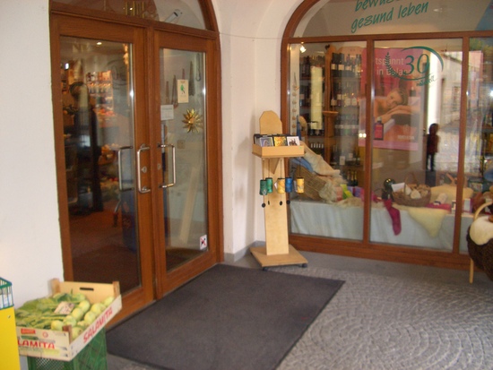 Kleiner Bioladen auf der Insel-Altstadt Lindau mit einigen veganen Produkten, wie Aufstriche, Limonade, Nussmuse, Margarine, Pflanzen-Drinks, Fleisch-, und Wurstersatz, Yofu, Tofu, Schokolade und Süßigkeiten, Kosmetika, Haushaltsreiniger, Chips und Snacks, Müsli....