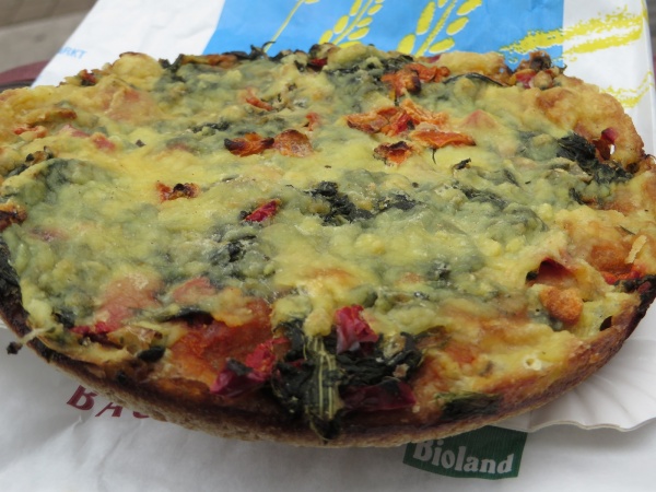 Veganes Angebot wechselt (z. B. Dinkel-Spinat-Pizza, Nussecken)