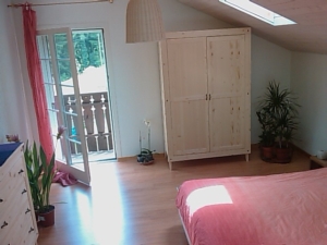 Unsere 6 ½ -Zimmer-Wohnung ist auf der oberen Etage des Zwei-Familienhauses und bietet zwei Gästezimmer mit Dusche und WC zur gemeinsamen Benützung. Das grosse Doppelbett-Zimmer (Fr. 55 - 1 Person/Fr.95 – 2 Personen)hat direkten Zugang zum Balkon und Garten. Das kleinere Zimmer (Fr. 45 - 1 Person/Fr.80 – 2 Personen) hat zwei Einzelbetten und Sicht in die Baumhecke oberhalb des Hauses. Vor unserem Haus liegt der 5 Aren grosse Bio-Gemüsegarten, aus welchem die eine oder andere Zutat fürs Zmorge stammt.