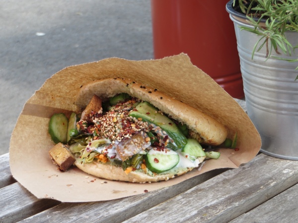 (Fladenbrot aus 100 % Dinkelmehl, hausgemachter Petersilien-Hummus, Ofen-Spitzkohl, Erbsen, Möhren, Gurken, frittierter Räuchertofu, gerösteter Sesam + Sesam-Dip)