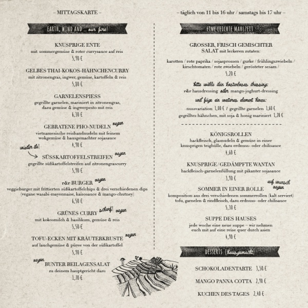 Auf unserer neuen Mittagskarte haben wir sechs leckere vegane Gerichte, zum Beispiel die gebratenen Pho-Nudeln, die Süßkartoffelstreifen oder die Tofu-Ecken mit Kräuterkruste! Außerdem sind unsere Salate und deren Dressings natürlich auch vegan.